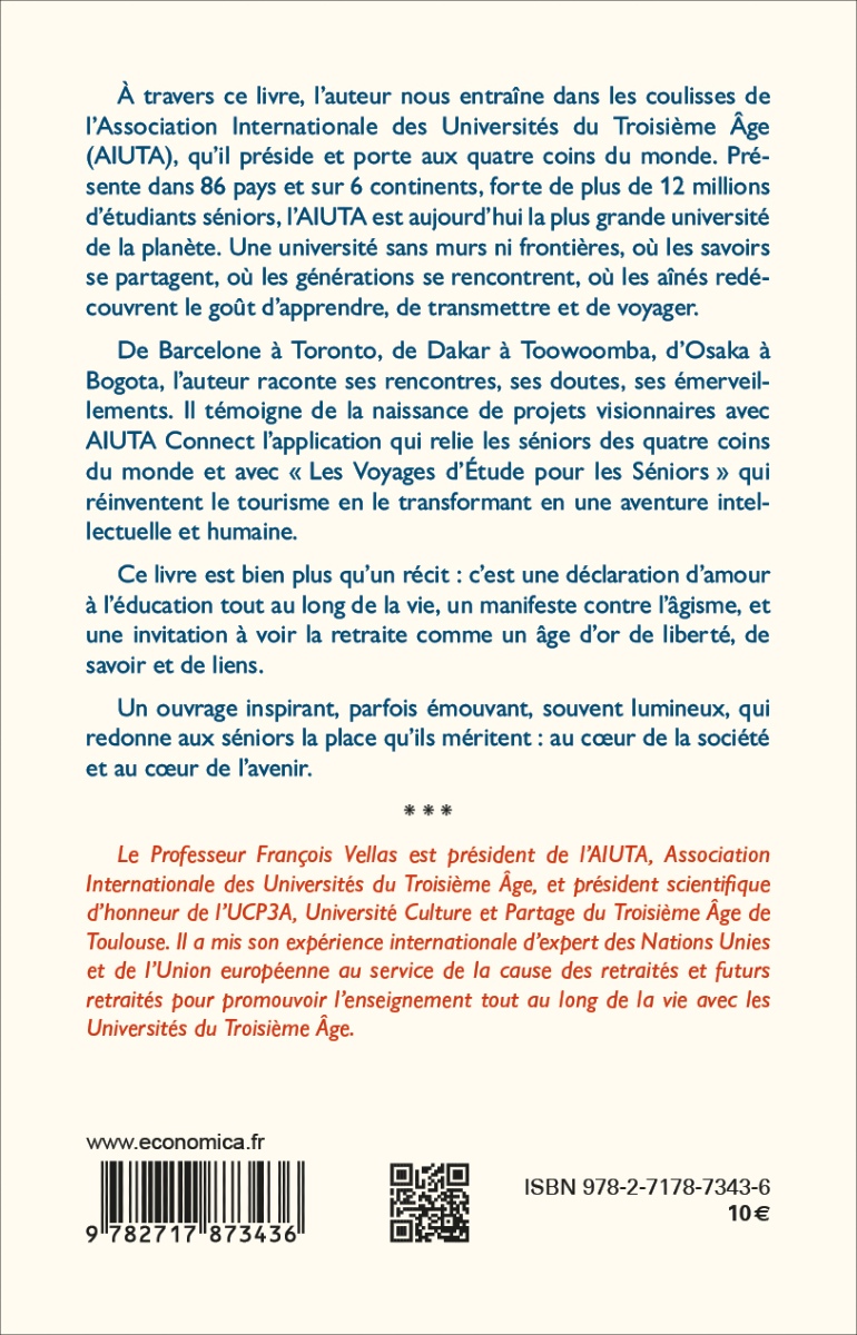 À travers ce livre, l’auteur nous entraîne dans les coulisses de l’Association Internationale des Universités du Troisième Âge (AIUTA), qu’il préside et porte aux quatre coins du monde. Présente dans 86 pays et sur 6 continents, forte de plus de 12 millions d’étudiants séniors, l’AIUTA est aujourd’hui la plus grande université de la planète. Une université sans murs ni frontières, où les savoirs se partagent, où les générations se rencontrent, où les aînés redécouvrent le goût d’apprendre, de transmettre et de voyager.